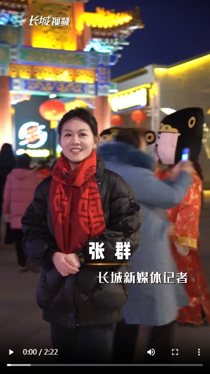 跟着熙攘的人群继续向里走,街边鳞次栉比的商店在各类彩灯的装饰下格外喜庆,美食小店、音乐餐厅、非遗体验馆等各色店铺人声鼎沸,店门口就排起了长龙。不远处的元宝街中心广场舞台,海城高跷、铜梁龙舞、快歌热舞、DJ灯光秀等演出轮番上演。小孩子被父母高高举起,伸长脖子聚精会神地看着演出。观众在台下叫好不断,掌声连连。“大家拿出手机,扫描屏幕上的二维码进入游戏,我说开始就摇动手机,次数最多的前三名观众就能获得我们准备的代金券和小礼品。三、二、一,开始!”演出中场的抽奖互动活动,将气氛推向高潮。