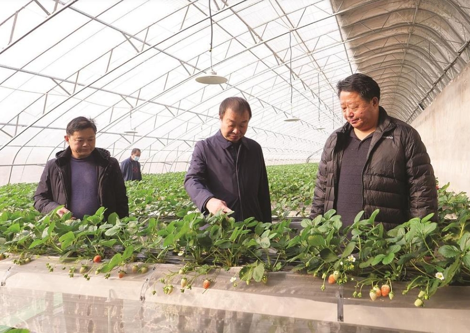 王建广(中)在大棚查看草莓长势。 武小凯 摄