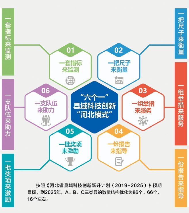 着力构建县域科技创新“河北模式”。一是创新工作思路。构建“一套指标来监测、一把尺子来衡量、一组举措来服务、一批奖项来激励、一份报告来指导、一支队伍来助力”的“六个一”工作体系,在工作路径、操作方法、支持措施等方面,形成加快县域科技创新的系统性方案。二是实施监测评价。建立包括5项一级指标和17项二级指标的县域科技创新能力监测评价体系,每年开展评价确定各县能力等次,搭建起县域创新竞进比拼的“大擂台”。三是开展奖励激励。由省政府办公厅印发年度评价结果,每年安排近2亿元资金对成绩突出的县给予奖励,激励先进典型发挥示范引领作用。四是加强帮扶指导。制定县域创新发展的共性任务和不同类型县应强化的个性任务,引方向、指路径;为各县量身编制科技创新评估报告,查找问题短板;组建科技创新辅导团,常态化开展科技创新调研辅导;发挥科技特派员、产业科技特派团、企业科技特派团“三位一体”服务优势,深入县域开展服务。五是统筹加力推动。出台《关于加快推进县域科技创新的若干措施》等政策文件,实施“盯末端、强服务、促发展”支持市县科技创新专项行动,培树县域科技创新先进典型,形成省市县合力推动跃升计划深入实施局面。