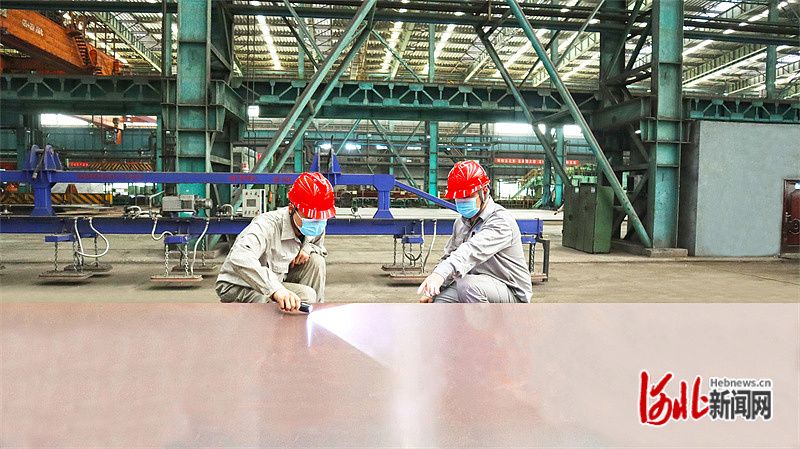 4月1日,河钢集团舞阳钢铁公司质量管理部的员工正在查看9Ni钢钢板的表面质量。 河北日报记者 李 巍摄