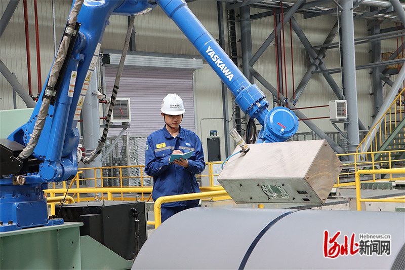 4月19日,河钢浦项2号镀锌产线工程师王云磊检查智能打标机器人运行情况。 河北日报通讯员 李彦良摄