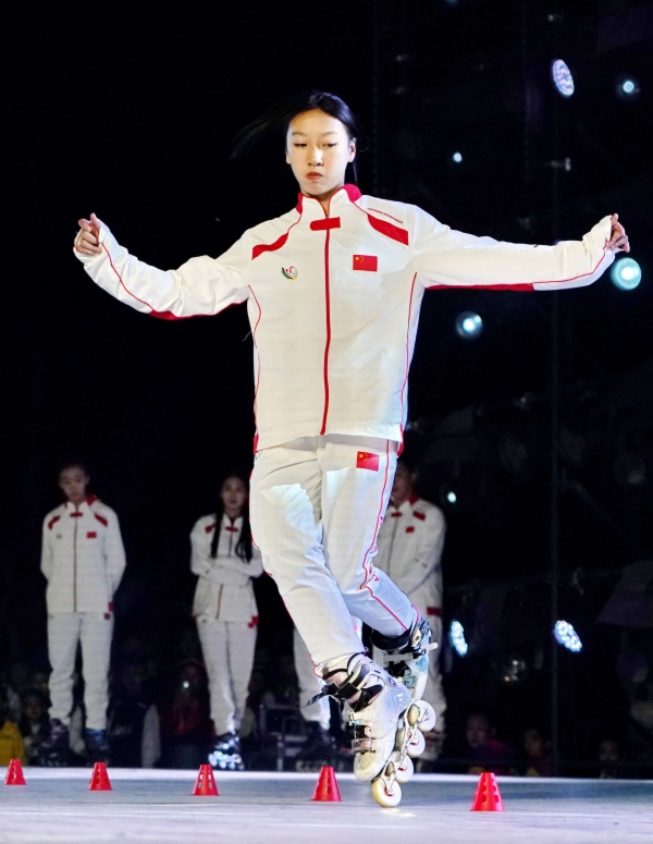 自由式轮滑世界冠军许小小在开幕式现场进行轮滑表演