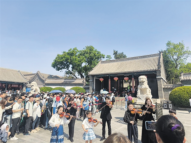 声传四方,乐声阵阵联动起来。3日上午10时,直隶总督署门前广场排队进景区的队伍被悠扬的琴声吸引,纷纷拿出手机围观拍摄。原来是市提琴协会的三名大学生、三名小学生在演奏提琴快闪。总督署的历史回响与西方器乐的荡气回肠搭起艺术之桥,中西合璧,凸显传承。