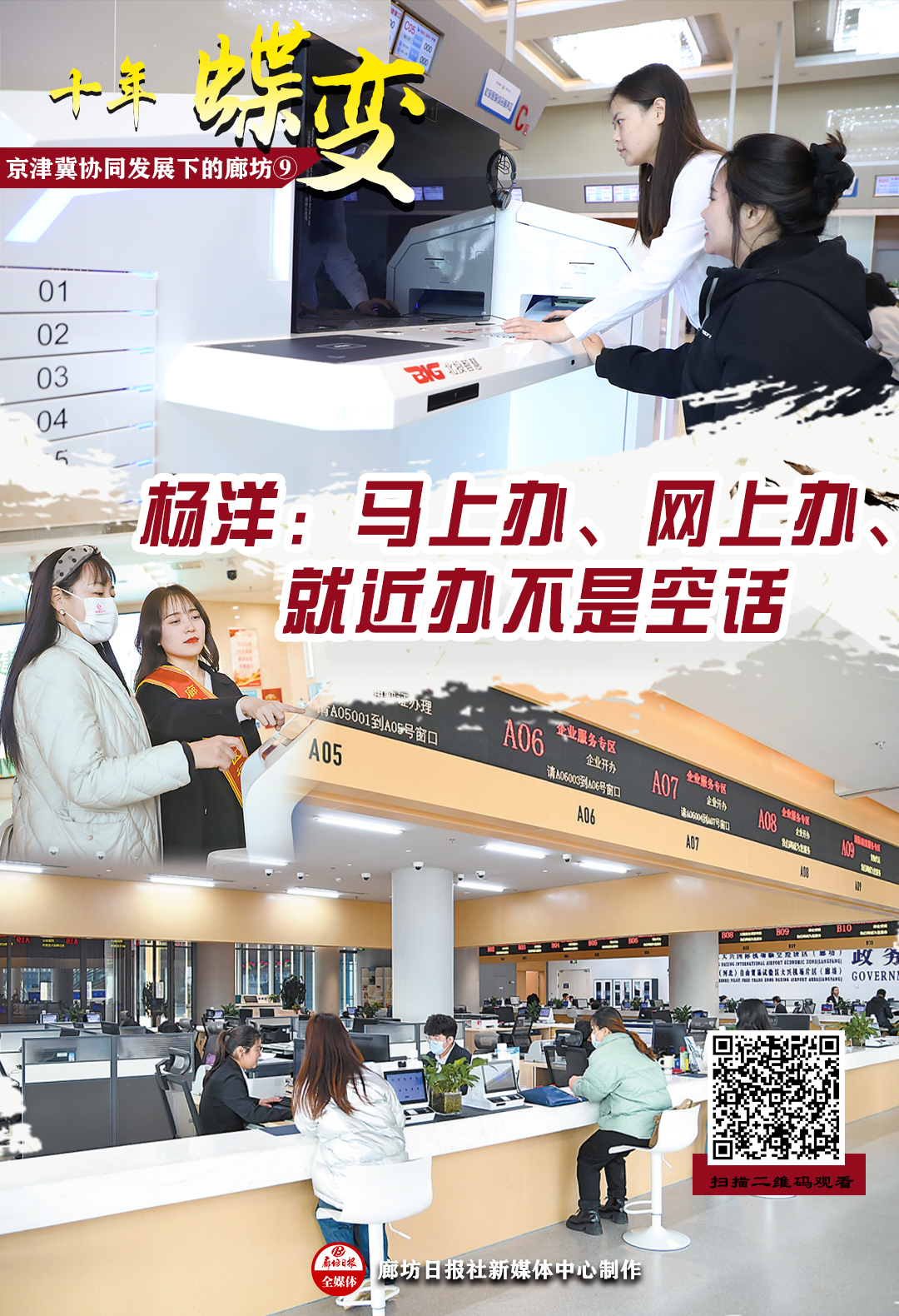 杨洋的自信有底气。2021年,廊坊北三县与北京市通州区签订《政务服务“区域通办”联动机制的框架协议》,实现了453项高频便民事项和70项涉企服务事项“自助办”,迈出了两地政务服务区域协作的第一步。目前,廊坊市已在副中心(通州区)政务大厅、通州区自贸区政务大厅、天津市武清区政务大厅布设自助终端,廊坊市本级、廊坊北三县、燕郊高新区政务大厅已设立北京自助终端,累计办理“区域通办”事项1万多件,自助服务终端累计访问4万余次。