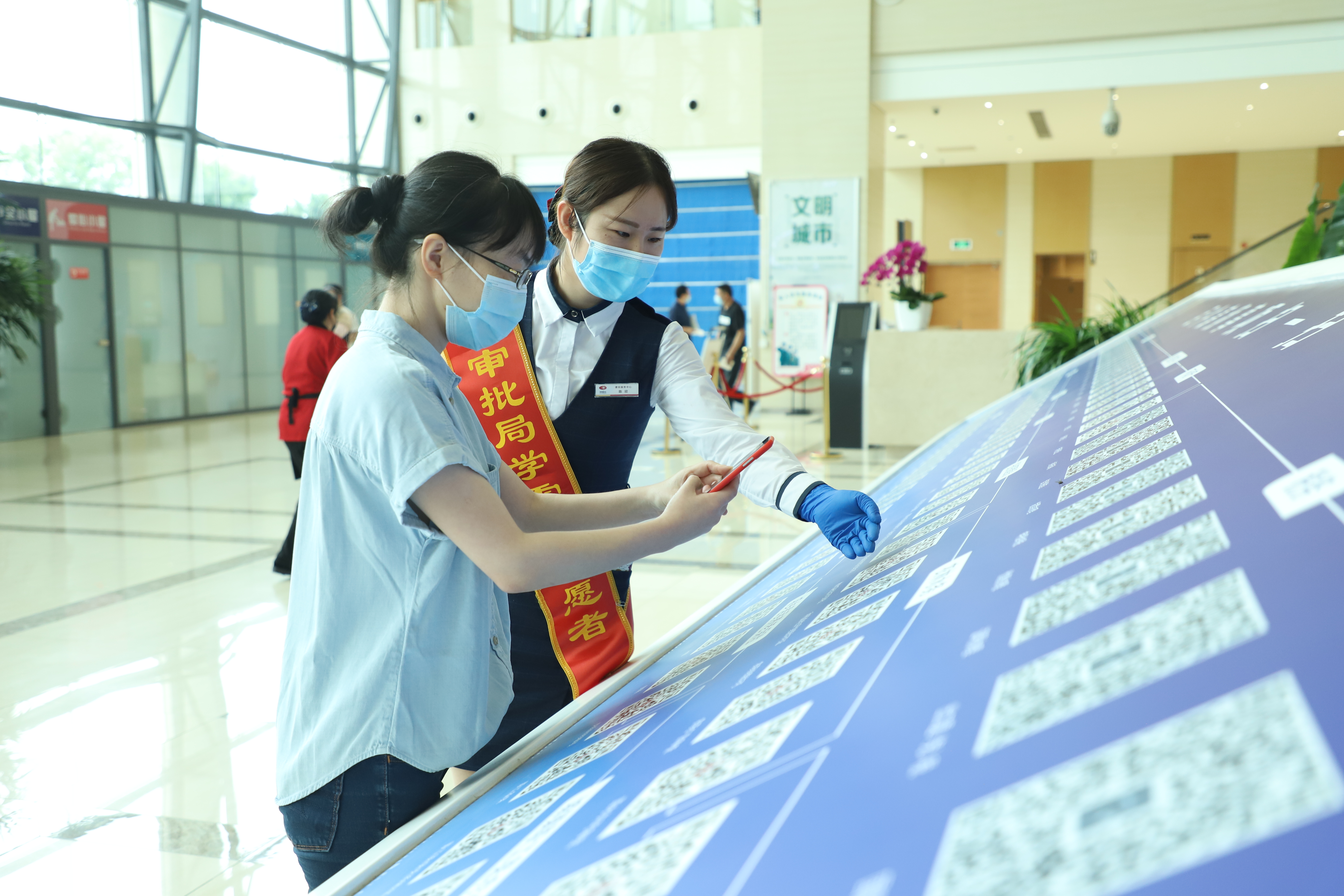 图为2020年6月9日,在香河县政务服务中心内,工作人员引导群众在百件高频事项二维码墙扫码获取事项办理的所有信息。记者 董旭旭 摄