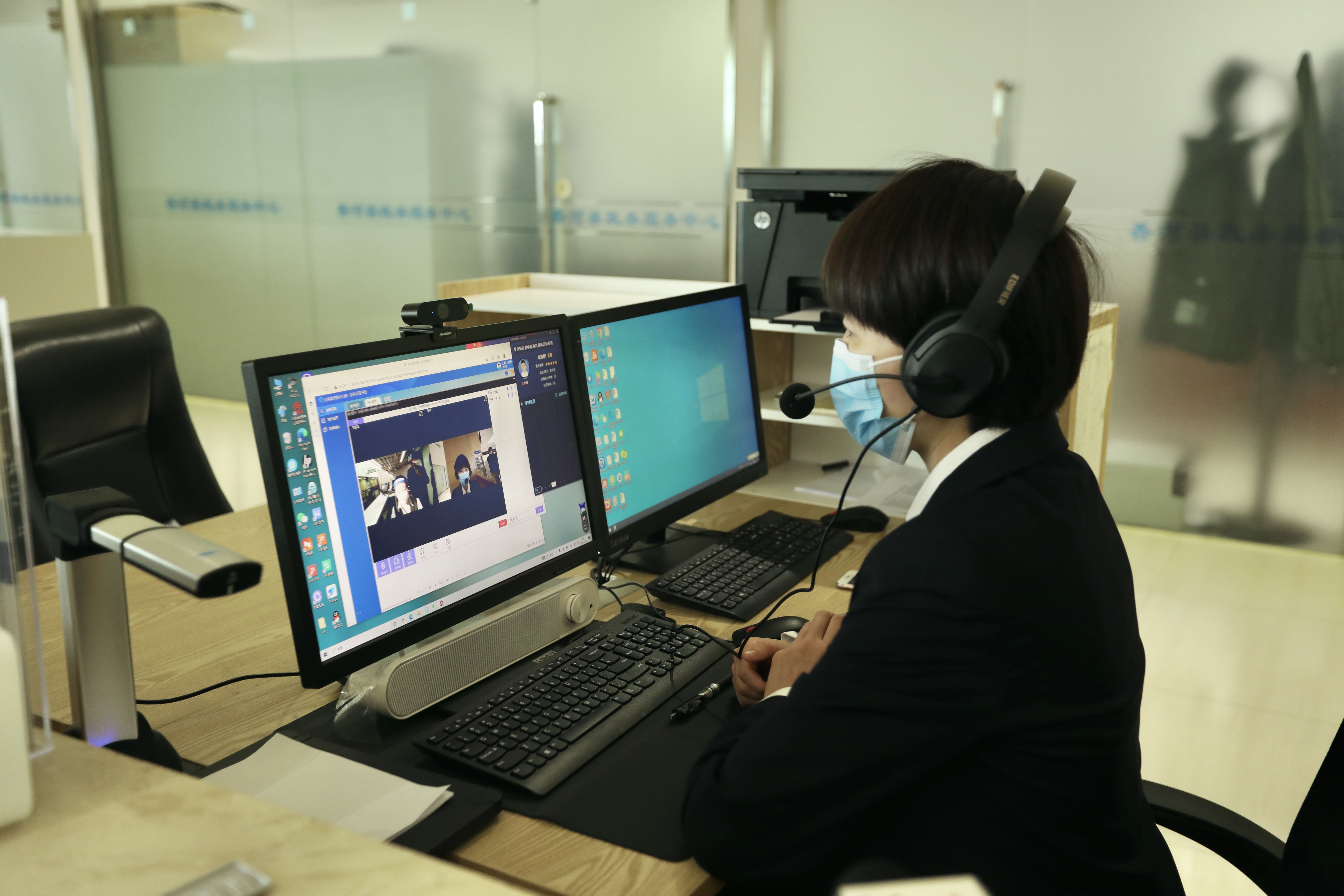 2023年2月23日,香河县政务服务中心工作人员在和北京副中心工作人员通过北京城市副中心统一接件受理平台办理“跨区通办”业务。记者 董旭旭 通讯员 陈宏儒 摄