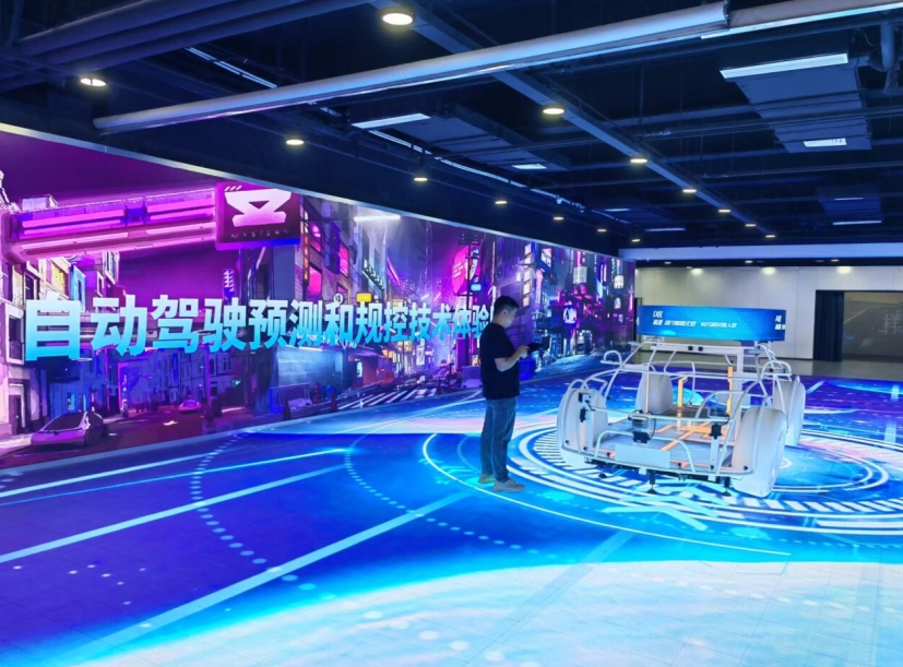 他的面前,是一台金属边框的四轮车。随着测试场地蓝白色电子图案变化,四轮车自动进行转弯、避让、刹车等动作。