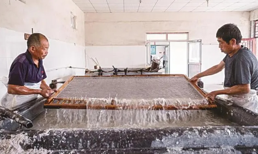 正抄、帮抄师傅腰系围裙,端起纸帘,竖直往下,回拉纸帘,纸浆均匀在纸帘表面流走……近日,享誉盛名的迁安手工桑皮纸在迁纸文化艺术产业园区浴“爱”重生。