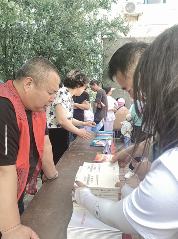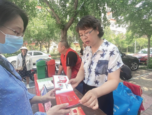 “这本《民法典》送给您,有什么需要解答的法律问题,咱们这有专业的法律人员。”烈日下,红卫里社区志愿者吴春民顾不得擦拭头上的汗珠,卖力地“吆喝”着。