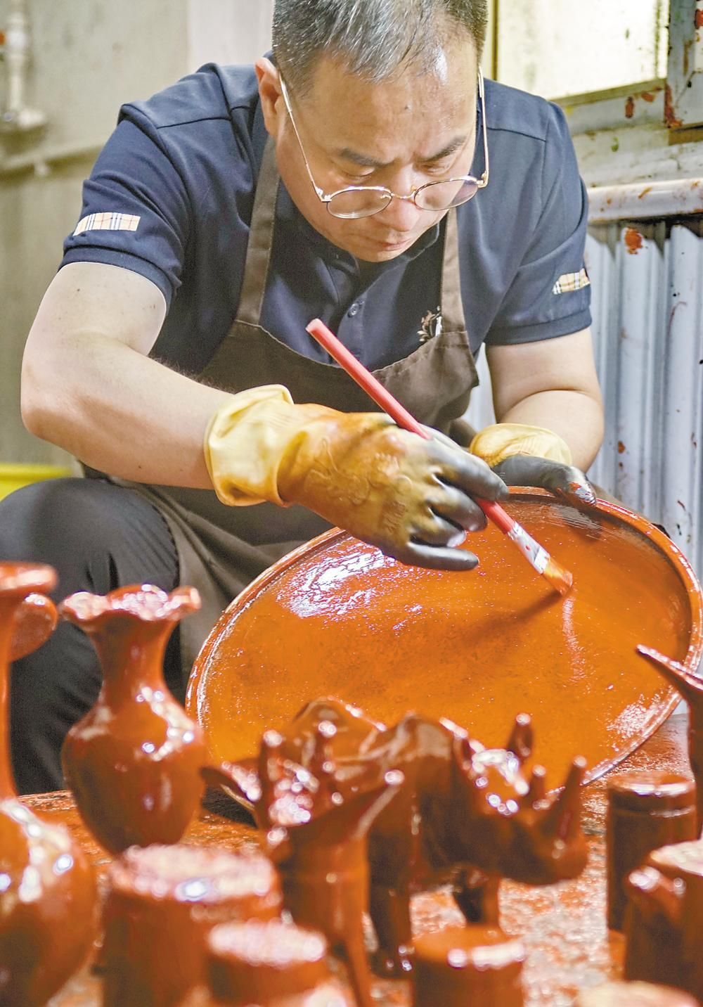 朱江在雕漆工作室对木胎盘子进行反复髹漆(5月30日摄)图片来源 新华社