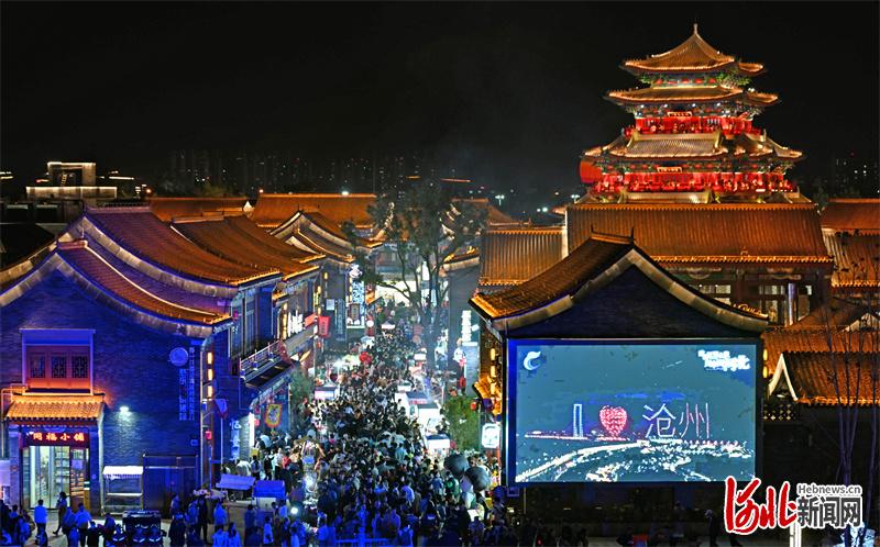 10月3日,沧州市中心城区大运河畔,汇集美食、文创、民俗等多种元素的南川老街灯火通明、热闹非凡。河北日报记者张昊摄