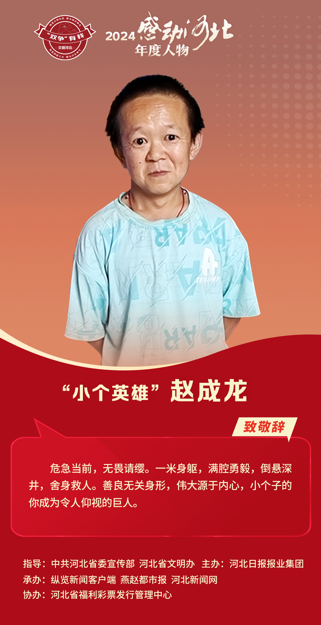 危急当前,无畏请缨。一米身躯,满腔勇毅,倒悬深井,舍身救人。善良无关身形,伟大源于内心,小个子的你成为令人仰视的巨人。