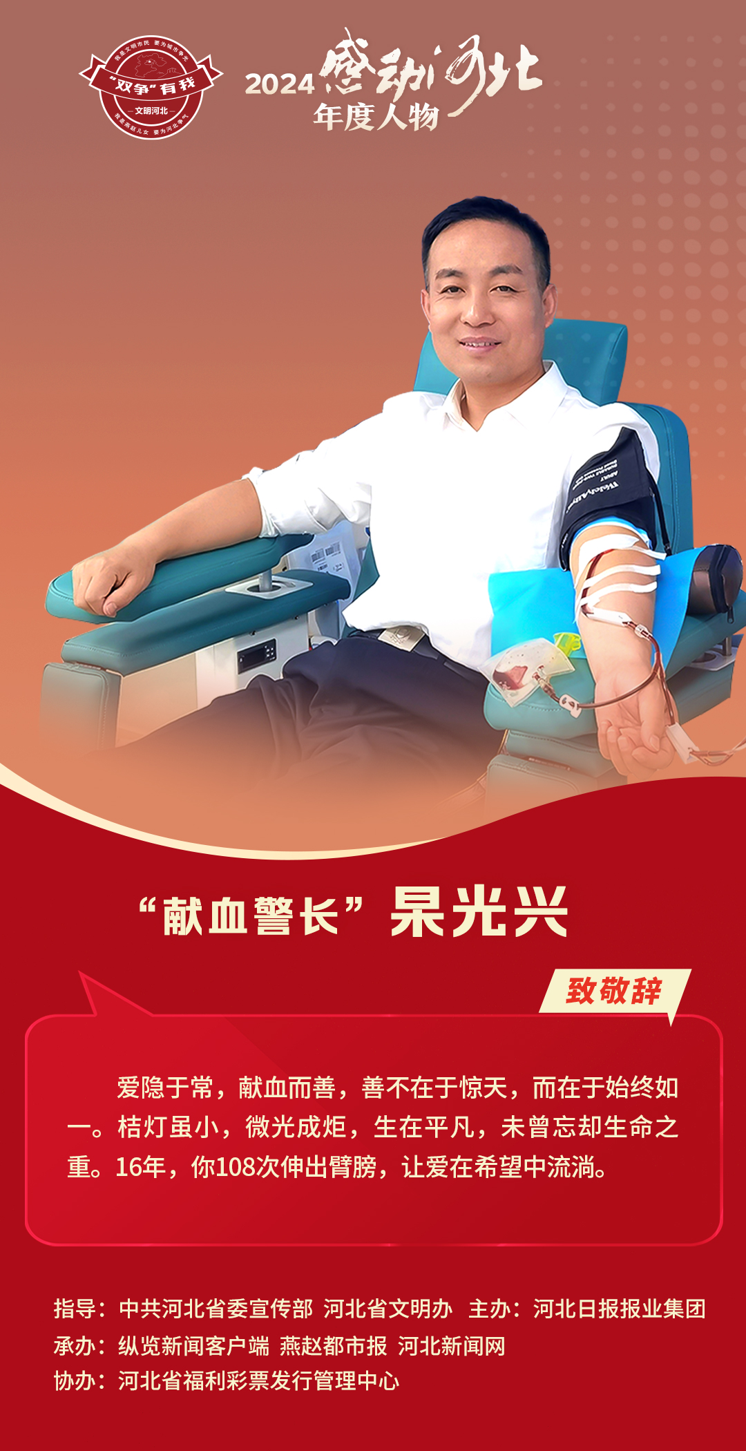 2008年8月19日,杲光兴去邯郸市公安局出差,办完事还有时间,恰好看到一辆献血车,就过去咨询。听护士说献一次血能挽救一条生命,他毫不犹豫地伸出了手臂。