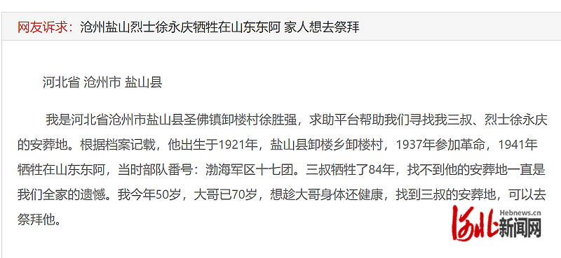 “我们寻找了84年都没有结果,三叔究竟安葬在哪儿?”近日,纵览新闻阳光理政平台收到沧州市盐山县圣佛镇卸楼村民徐胜强的求助,他的三叔、烈士徐永庆1941年牺牲于山东省聊城市东阿县,想找到他确切的安葬地。