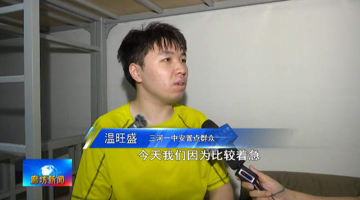 三河一中安置点群众温旺盛:今天我们因为比较着急,吃的就是泡面,还有火腿肠。明天去食堂吃饭,感觉还是很周到的,像回家一样。