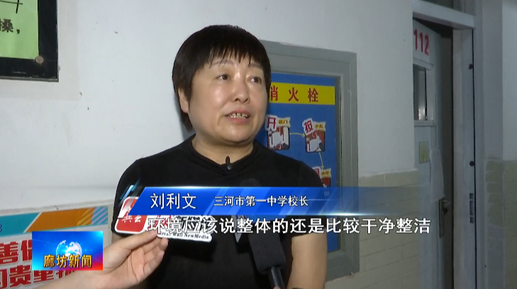 三河市第一中学校长刘利文:环境应该说整体的还是比较干净整洁,每屋有空调,有洗手间,每层都有热水器,居民们还可以在这洗澡,明天早晨我们的两个食堂都开放,7:30—8:30吃早餐,油条、冷面、包子,中午就是两荤一素一汤,再煮点绿豆汤,防止居民中暑,晚上也是大众菜,就跟学生吃的差不多。