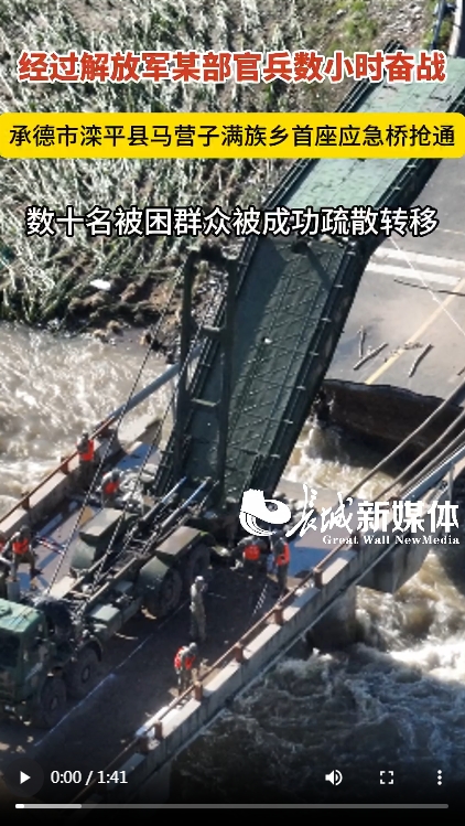 长城网·冀云客户端讯(记者 刘磊 赵大鹏 樊志鹏 侯嘉正 冯喆 陈志洋 张群 杨蕾)7月29日下午6时许,经过解放军某部官兵数小时奋战,在承德滦平山体滑坡灾害中受损中断的王北沟门桥临时桥板成功铺设,实现应急抢通,初步具备通行能力,数十名被困群众被成功疏散转移。 随后部队官兵继续在对岸铺设沙袋、加固桥板,保障后续机械、车辆安全通过,开展进一步救援工作。