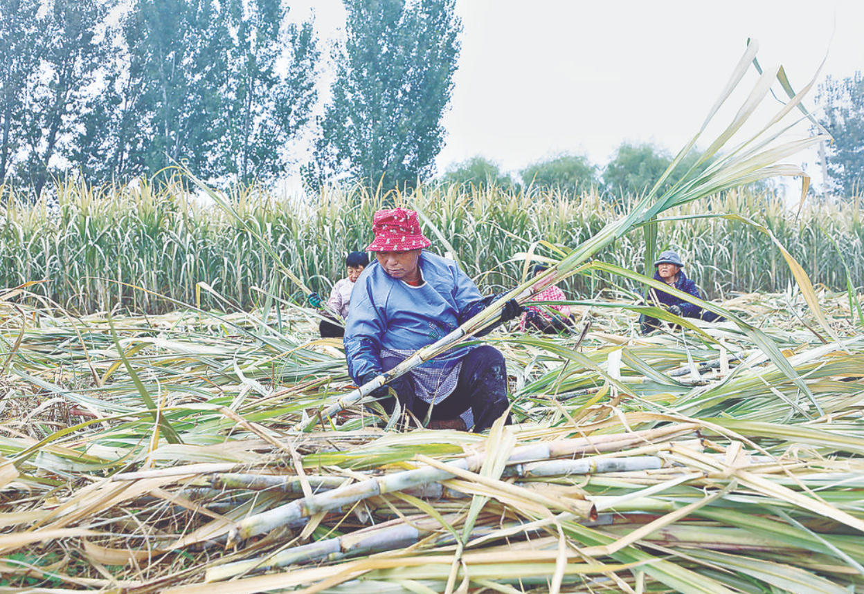 在固安县彭村乡小辛庄村的甘蔗种植地里,农户采收甘蔗。通讯员 陈放 摄