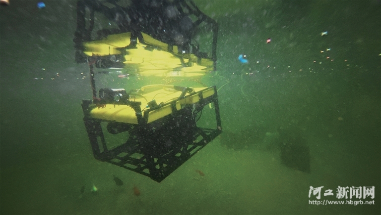 12月10日,水域机器人正在燕山大学实验室测试水池中开展姿态推进控制实验。这款由唐山港集团股份有限公司与燕山大学联合研制的机器人,可深入海面以下120米进行探测,主要应用于船舶吃水线自动读取、码头结构探伤等场景。