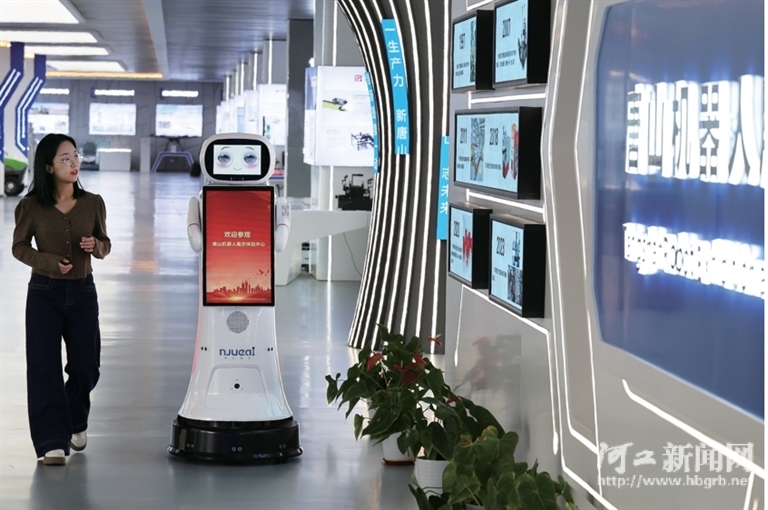 12月12日,在唐山机器人展示体验中心,智能导览机器人“小博士”为观众讲解唐山机器人产业发展情况。如今,唐山机器人企业已达266家。