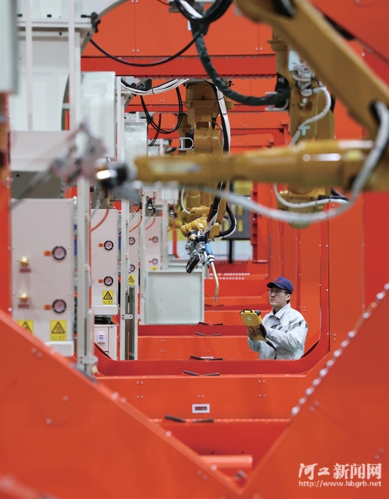 12月12日,在唐山开元自动焊接装备有限公司组装车间,技术人员调试焊接机器人系统。该生产线可通过多个机器人协作完成汽车起重机臂的全自动焊接。
