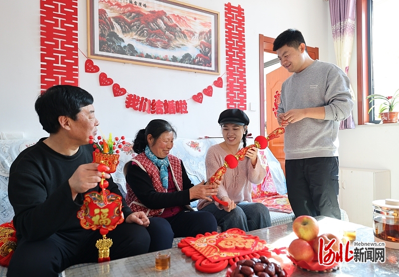 1月31日,吕晓哲(右一)、王亚(右二)为家里精心准备了年节饰品。河北日报记者 赵海江摄
