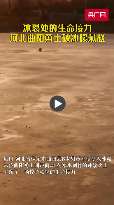 央广网保定2月7日消息(记者王艺霖 见习记者田嫣)冬日余寒未散,位于太行山麓的河北曲阳,仍被料峭冷风裹着。潮悦滨湖公园的冰面突现破裂,保定市曲阳县8岁男童不慎坠入冰窟,退役军人、普通群众、“05后”青年多人闻声而动,从四面八方奔赴而来,以手破冰、以身为梯,在寒水刺骨的冰窟之上,上演了一场惊心动魄的生命接力。冰凌割掌,寒水浸骨,三分钟生死时速里,一条由血肉之躯铺就的“生命通道”,在寒冬湖面倔强延伸。四分钟不到,大家携手成功救出男童,勾勒出燕赵大地动人的暖心画卷。