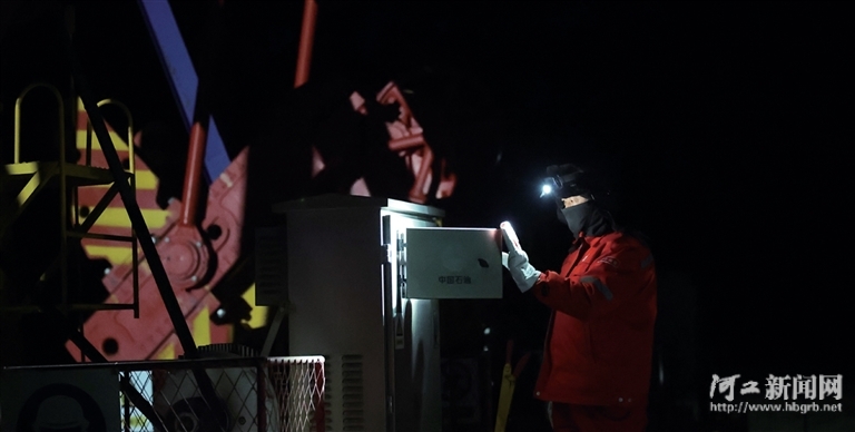 2月6日傍晚,于怀文查看抽油机的运行情况。