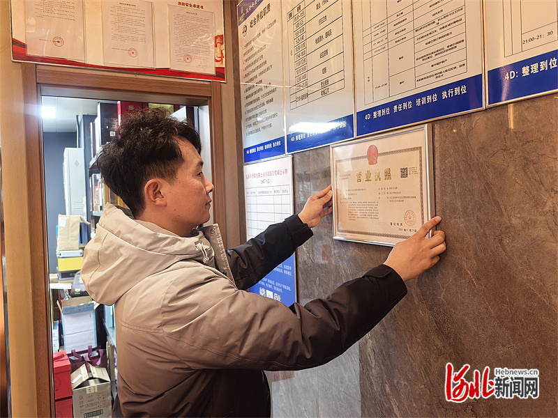 2月11日,“五谷丰登”餐饮店老板朱丽君正在摆放营业执照。河北日报记者 解楚楚摄