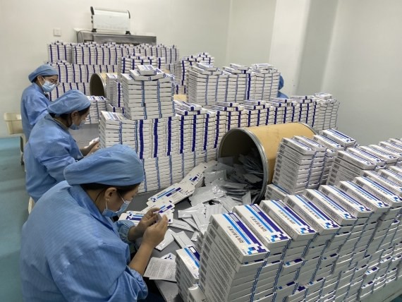 河北东风药业有限公司的工人们正在进行药品外包装工作。
