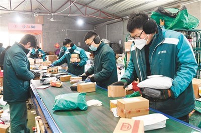 1月1日,中国邮政集团公司河北新乐市分公司分拣车间内,工作人员在分拣快递。贾敏杰摄(新华社发)