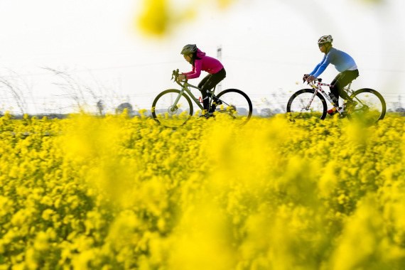 图为近日,骑行爱好者在江西省樟树市永泰镇官湖村油菜花海中骑行、赏花。(周亮摄)