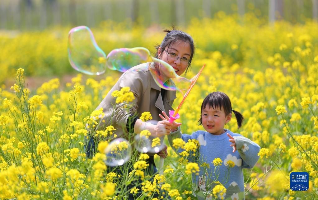 4月9日,家长带着孩子在山东省滕州市洪绪镇一处油菜花田里玩耍。春和景明,人们踏青游玩,乐享春光。新华社发(李志军摄)