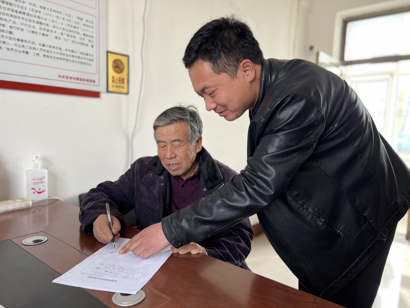 ▲村红白理事会工作人员指导村民王建军填写登记表,并讲解喜事新办的要求,还与他签订了《婚事新办杜绝大操大办承诺书》。